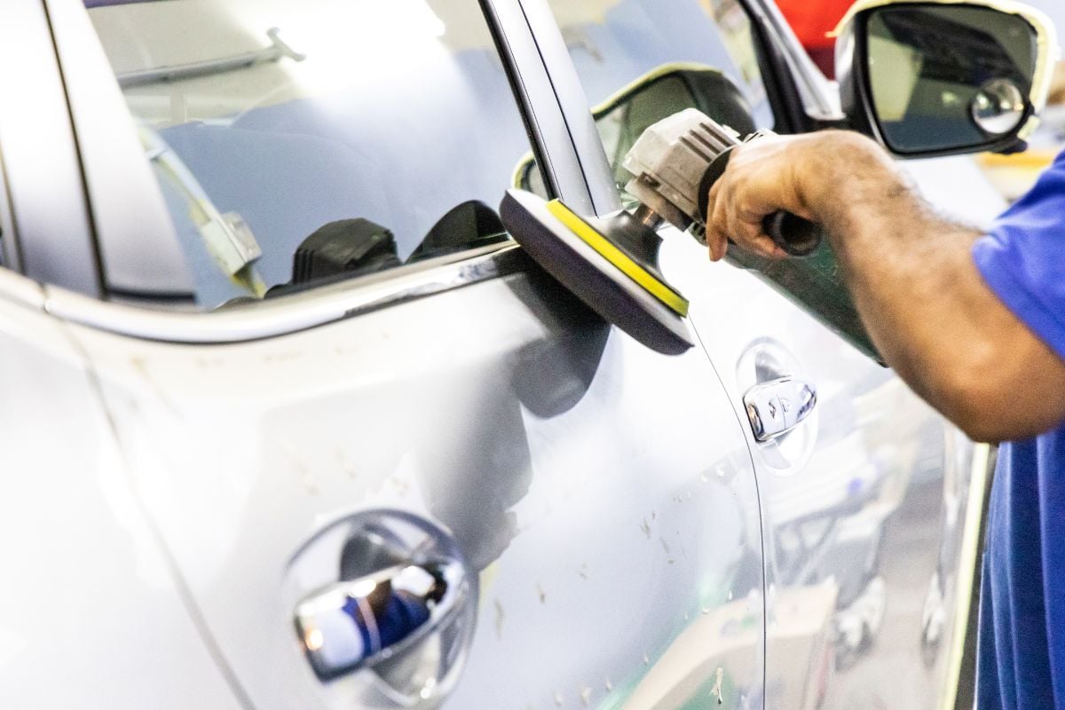Titelfoto: Pflegewachs wird am Auto mit Poliermaschine aufgetragen (Rechte: Canva.com)