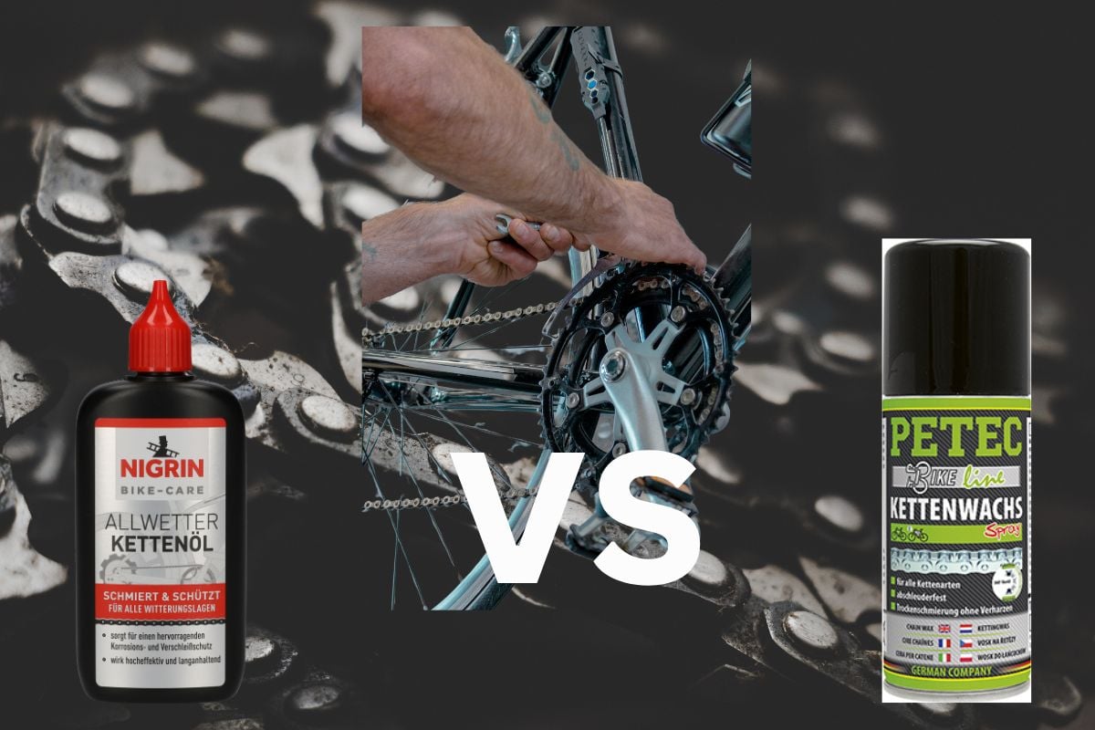 Titelfoto: Fahrrad Kettenöl vs Kettenwachs (Quellen: Nigrin & Petec)